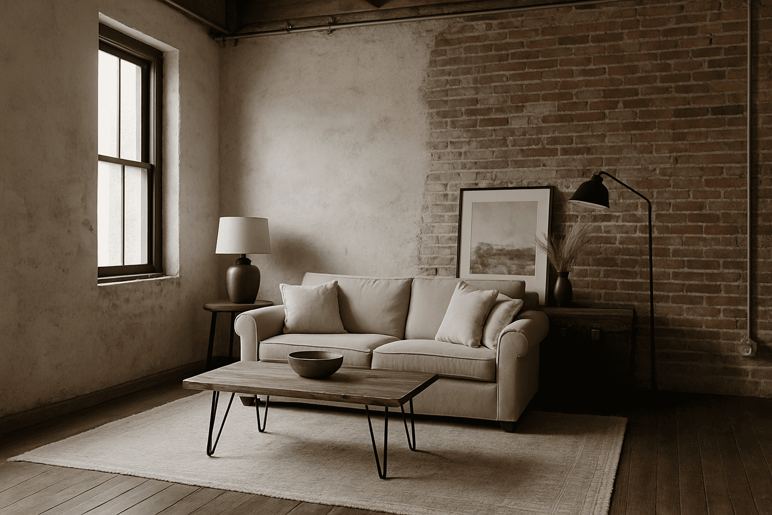 для клиента это означает использование натуральных и немного грубых материалов: состаренное дерево, кирпич, металл с патиной, неоштукатуренные стены. мебель простая, удобная, без лишнего глянца, часто с винтажными элементами, создающими атмосферу времени.